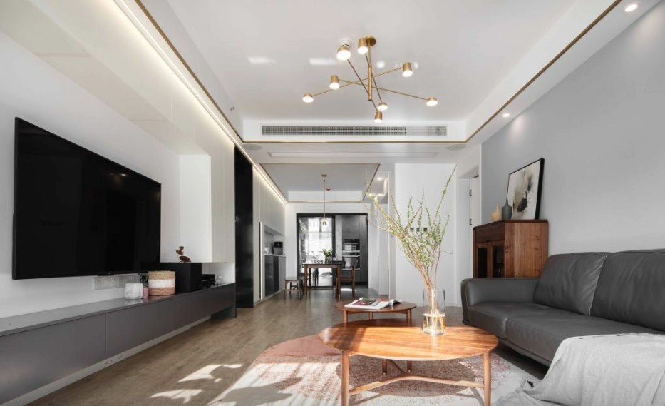 全屋以灰色调为主 通过墙面 家具和谐统一的同色系 以及调色与不同深浅的层次感 营造一个简约优雅又舒适的家 原本的实木地板与白色天花板形成了对比 四面围合的灰好似蜿蜒的绸带 流淌在空间的每个角落 赋予家更大的安全感和温馨氛围