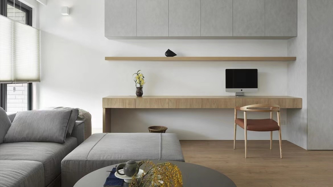 客厅的设计可谓是别有用心,一扇落地的大窗,灰色的沙发,宛如屏障一般的电视墙,原木色的小吧台与简单却又阔绰的餐区。将工作区设计成小吧台的样子,不仅是巧妙地增加更多可利用的空间,在方便屋主办公的同时又增加了工作的情调。