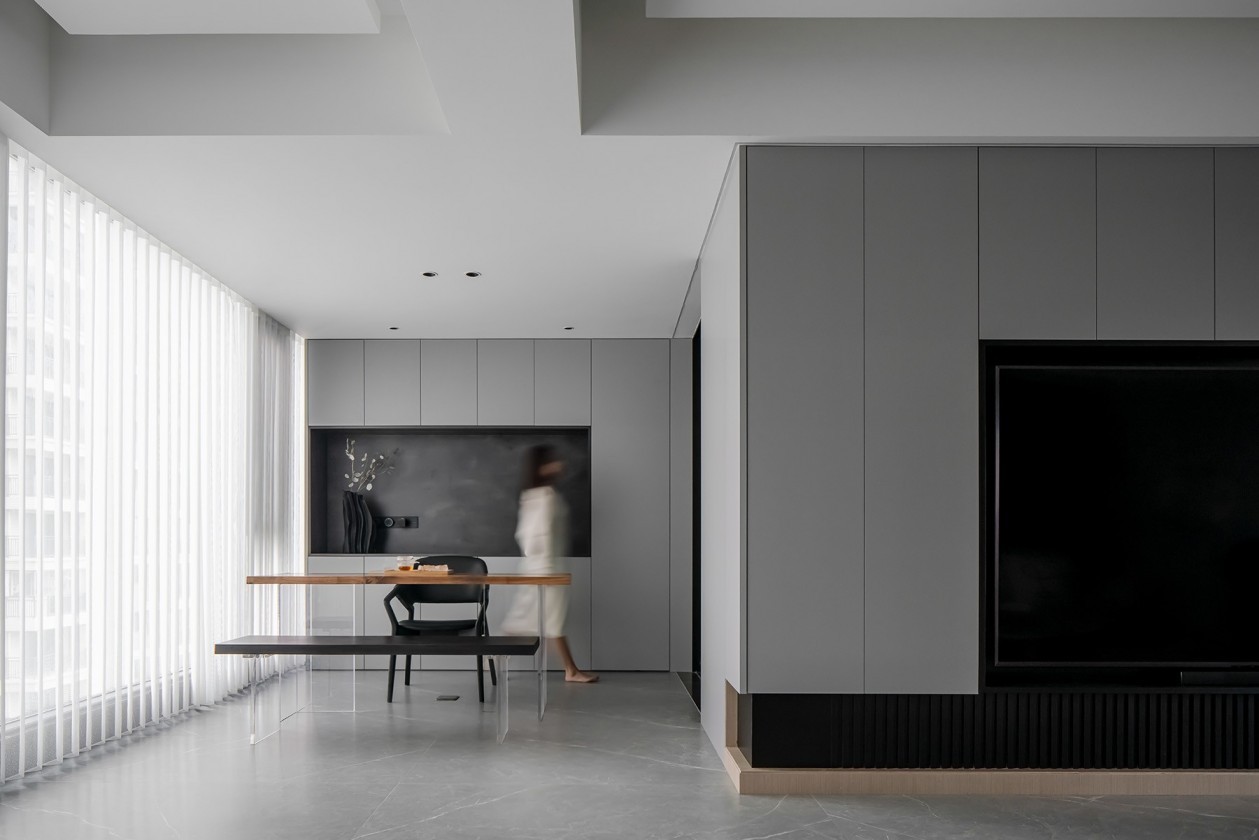 客厅电视面做黑色内嵌开放格,一整面形成一个整体,造型简洁却不乏储物