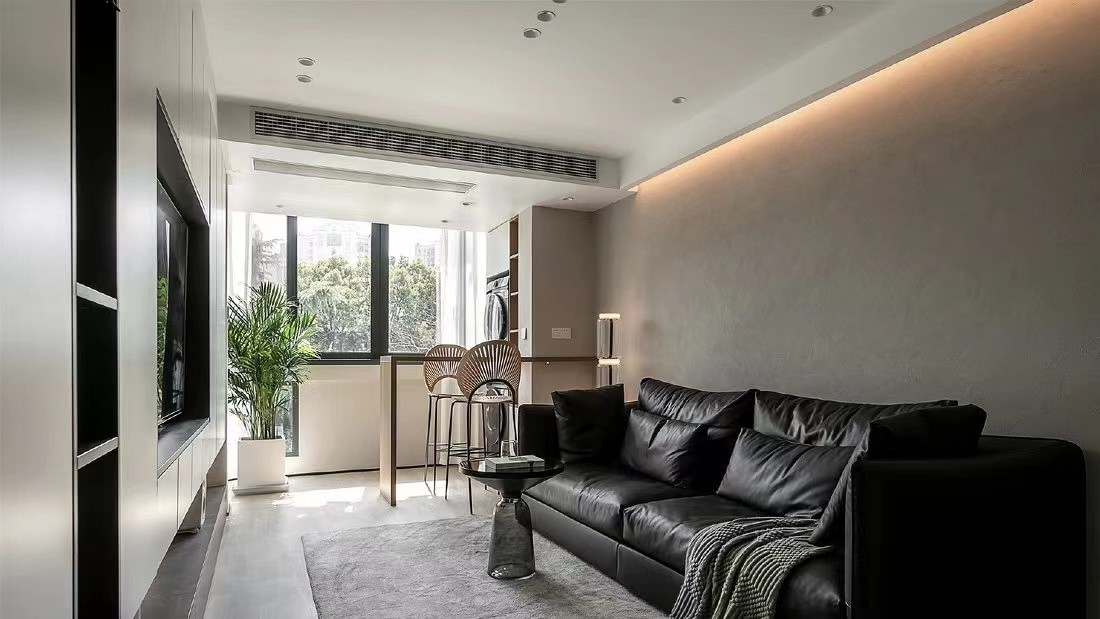 客厅的横向开间并不充裕,但考虑到业主对储物的需求,我们选择在电视墙做了整面柜体。电视柜做了部分镂空设计,更加轻巧灵动,纵向的开放架可以放置收藏物品展示,横向底部做了30cm挑空,刚好可以放置音响,美观与实用于一体