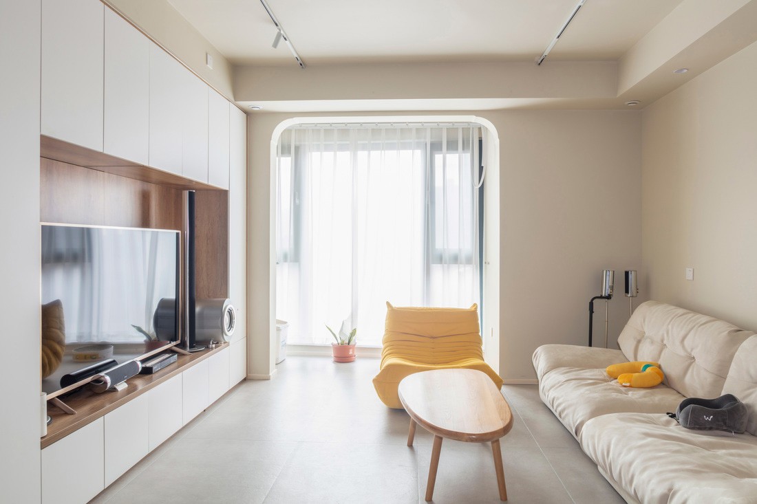 沙发背景与全屋统一的色系,整体低饱和度的颜色,***奶油色系的家居搭配,高冷又有质感意境,温馨且治愈。搭配黄色单人毛毛虫沙发,和原木小茶几,无意中整个客厅变得好温柔,干净的奶白色系,简约又***。