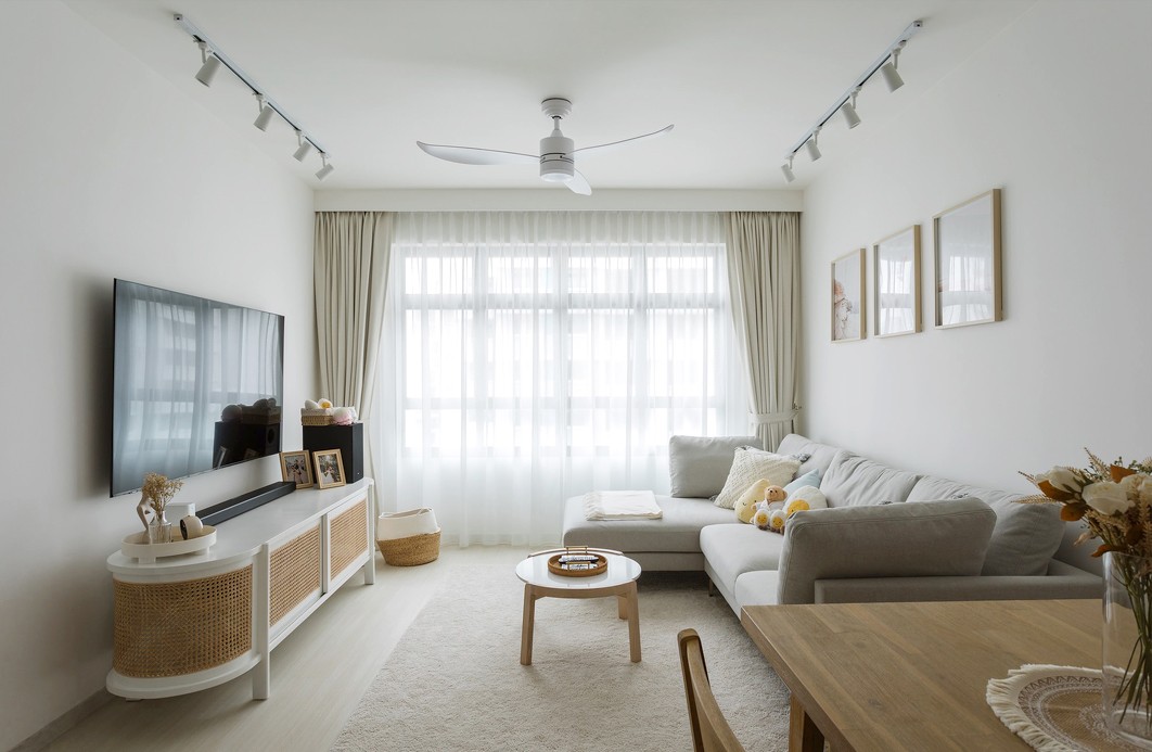 软装上选择浅灰色的布艺沙发,搭配灰白色的羊毛地毯,营造出一种奶呼呼的舒适感,背景墙搭配三两挂画为装饰,与空间质感形成对比,起到一定的点缀感,空间在搭配上小巧精致的茶几,满满的现代简约感。