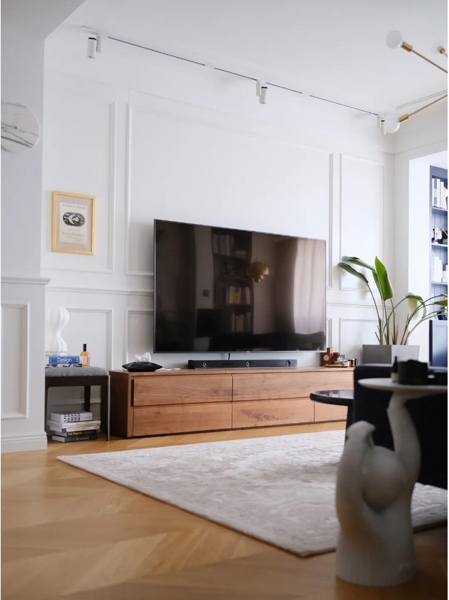 进来就映入眼帘的电视墙,以及法式轻奢的必备地毯。
