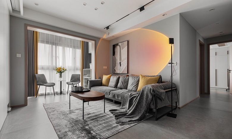 客厅通铺素色水泥砖,大气又环保,简约线条灯,增加空间感。
