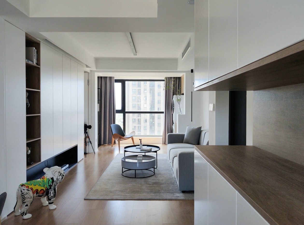 沙发一侧用了极简的圆柱吊灯,适当的留白后,整个空间观感非常和谐。