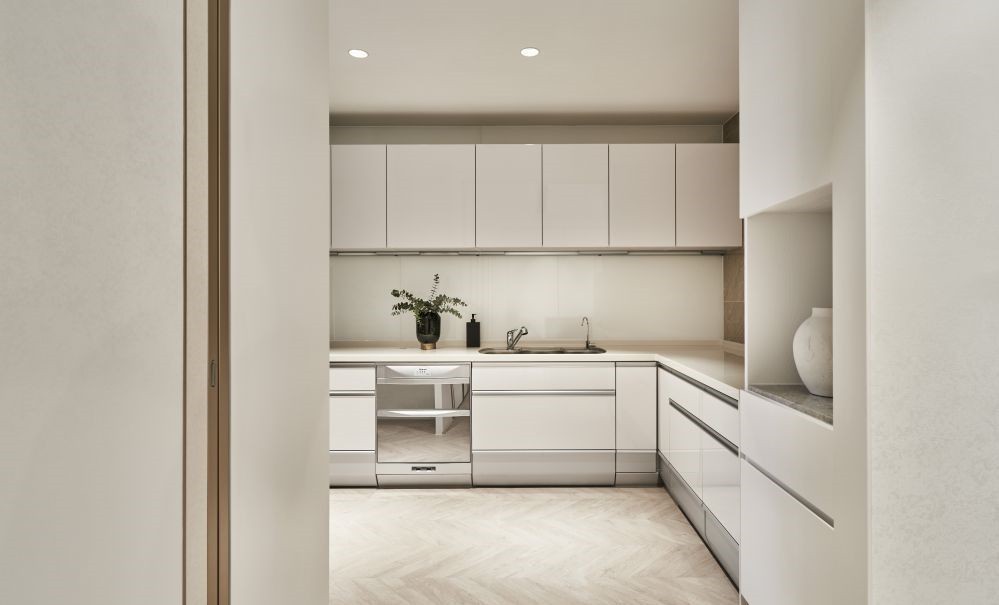 厨房U型厨房设计,地柜和吊柜让厨房拥有大量的储物空间,整洁干净还易于打理。白色面包砖、白色台面。