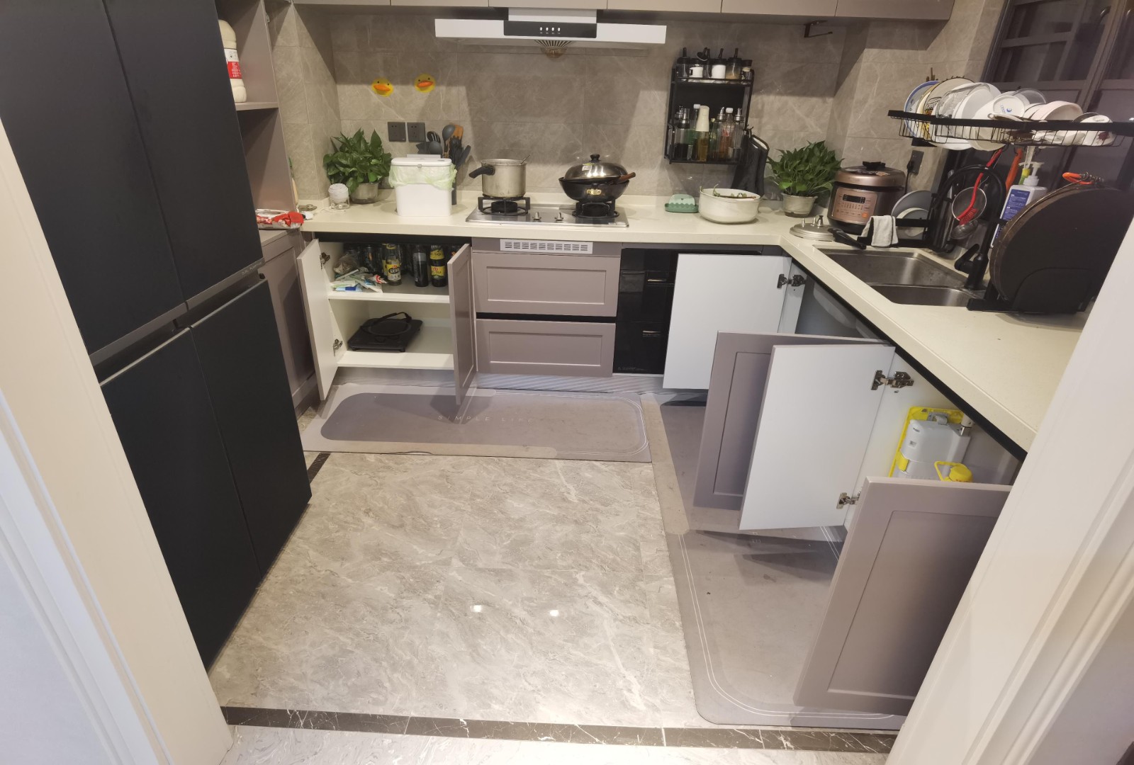 厨房首先全部吊柜以及橱柜门更换为灰色系列,橱柜加拉篮,吊柜部分最左边镂空出来放冰箱,然后做一组柜子,业主可以摆放的电器等;橱柜上面加五金件,方便碗具的摆放沥干再放入拉篮;