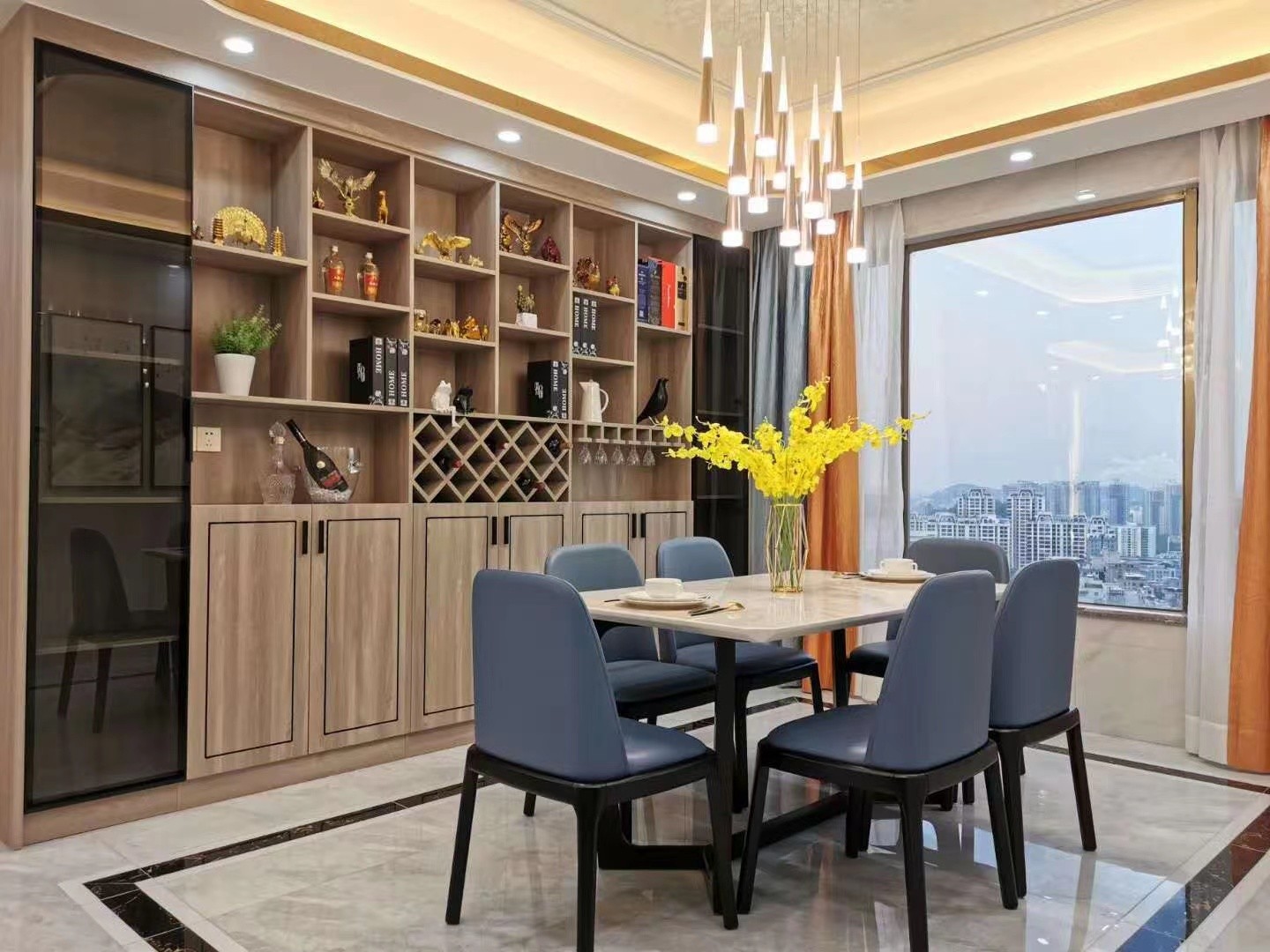 客厅整体风格以轻奢风为主,天花灯带磨圆角处理,酒柜采用高端定制。