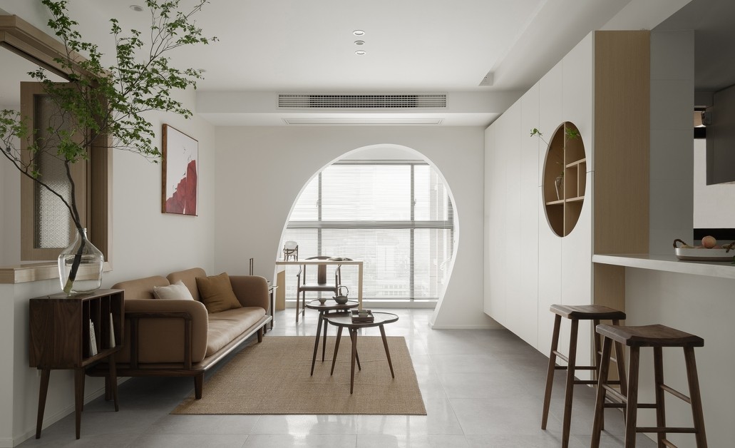 移步移景,视线的停留之处皆是景。 不规矩的方圆门,成为从餐厅的景墙转折到客厅阳台的亮点。