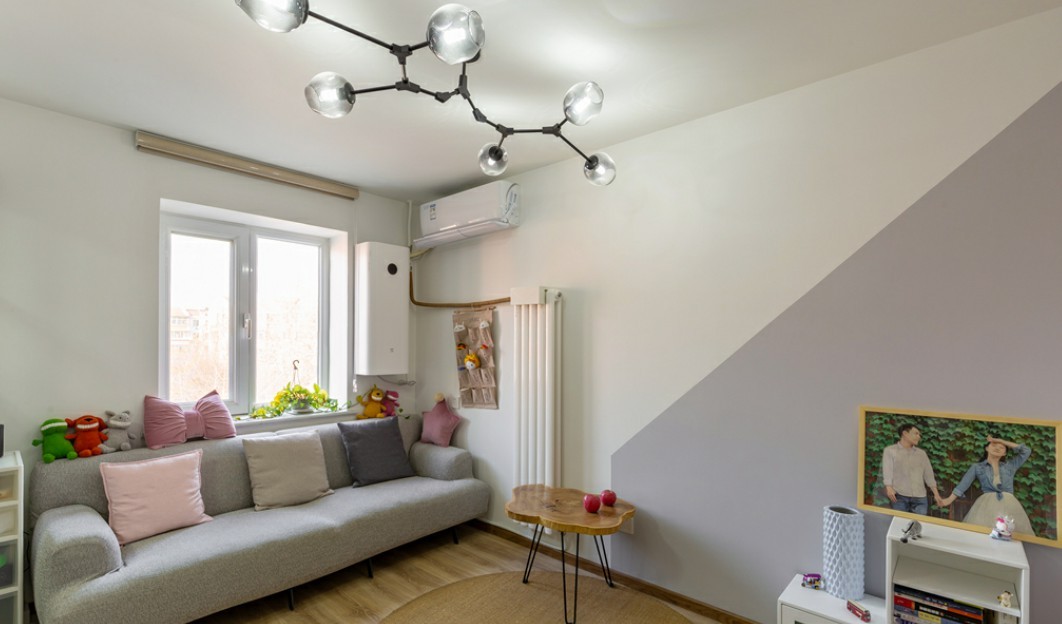 格局以长方形呈现,且仅有一个1m宽的窗户,采光一般,因此客厅空间整体色调以原木色,大面积白色,灰为主,用简单的装饰以及大面积的刷白提升空间的明亮度,从视觉上看空间更加宽阔