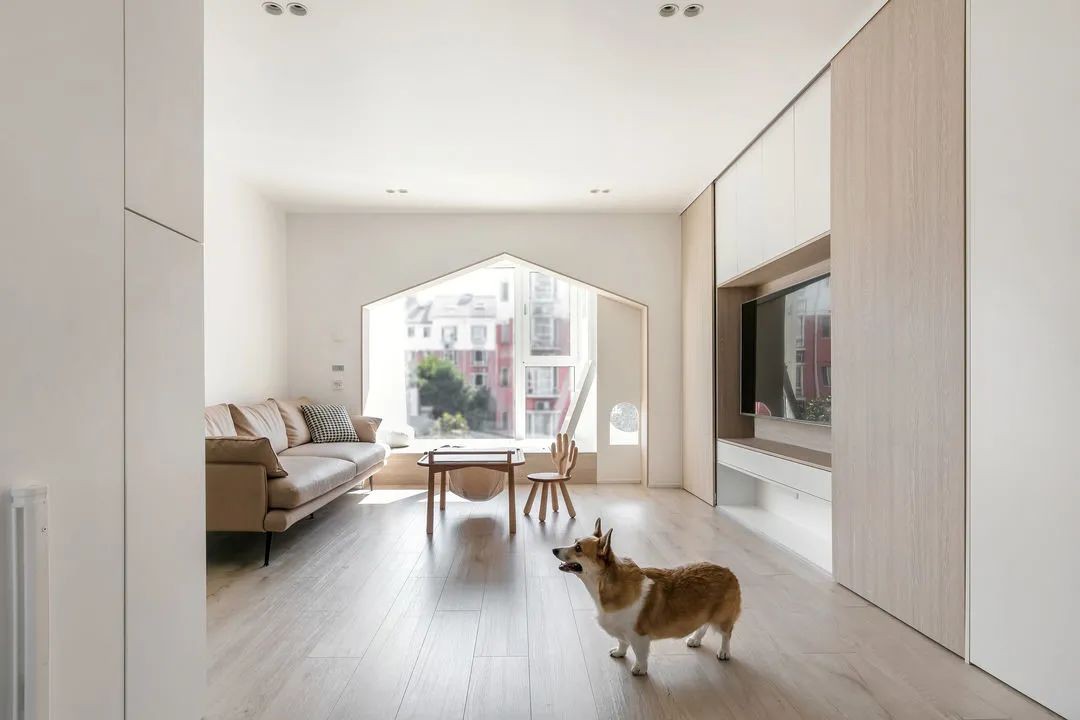 客厅简洁不造作,原木白为空间基底,加上平顶无主灯设计,干净简练轻松宽敞。利用城堡造型增加空间趣味性。