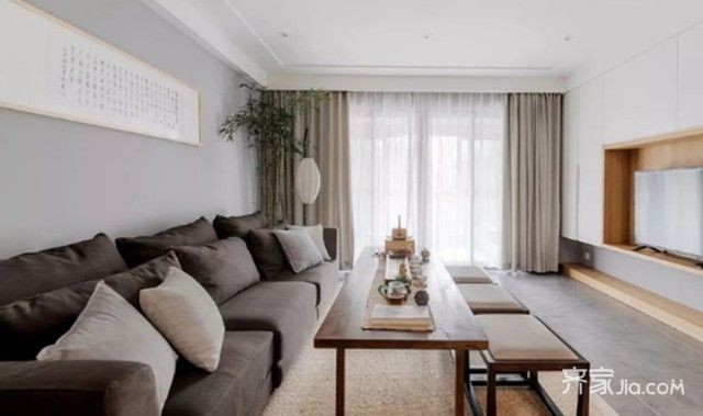 客厅,地面通铺水泥色地砖,极简顶面用点光源取代主灯,整体配色清简质朴