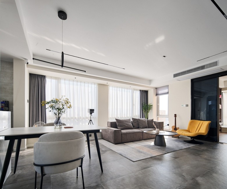 顶面是干净的无主灯设计,客厅去除了常规的电视背景,设计收纳柜+投影幕布的形式,展现丰富多元的年轻型生活方式。