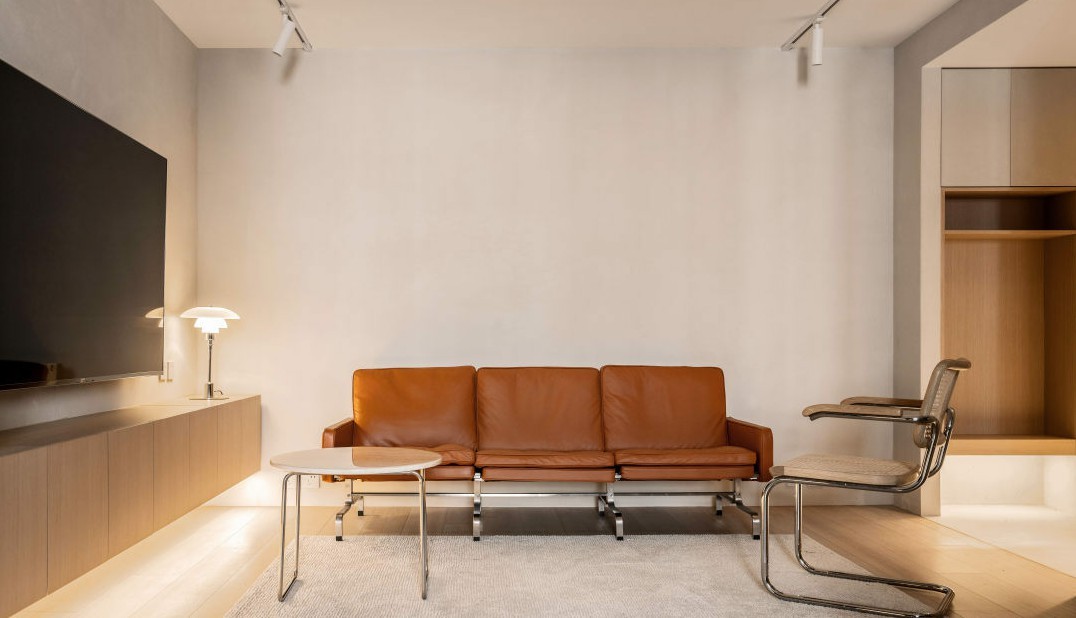 从玄关看向客厅空间 空间的材质从进门延续到客厅,墙面使用了带有肌理感的浅灰漆,地面大面积橡木色地板,电视柜也定制了橡木色吊柜 橘色沙发为经典款PK31,茶几桌面为黄洞石
