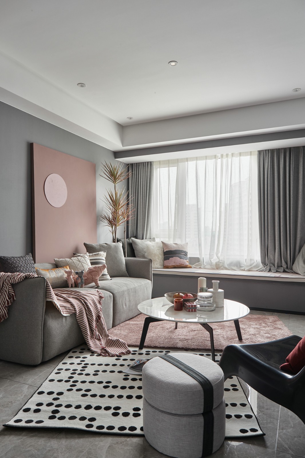 黑波点地毯和烟粉色地毯交叠,使本来平淡的灰色调客厅瞬间个性十足,颜值爆升。
