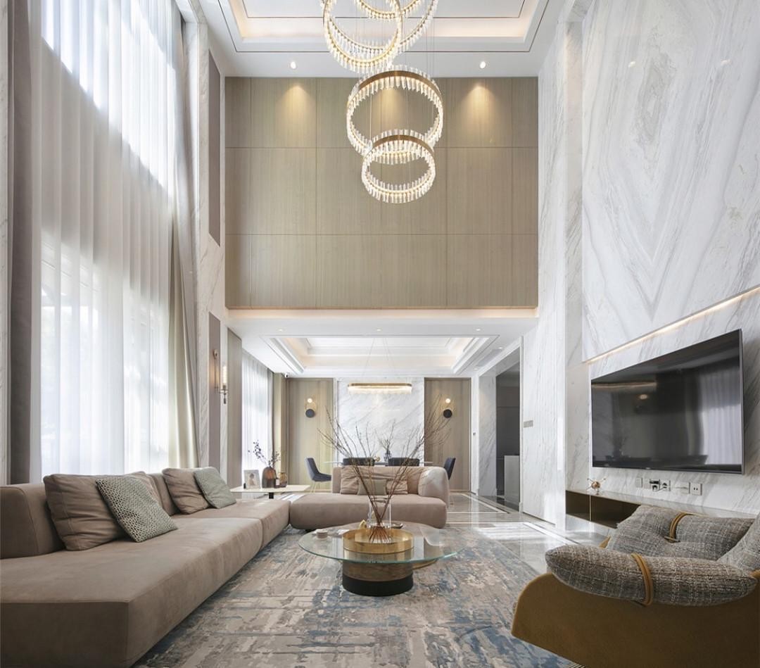 客厅整体为挑高的空间,增加了视野的纵深感,吊顶安装有组合水晶吊灯,搭配金属圆环修饰,彰显出不凡脱俗的高品位。