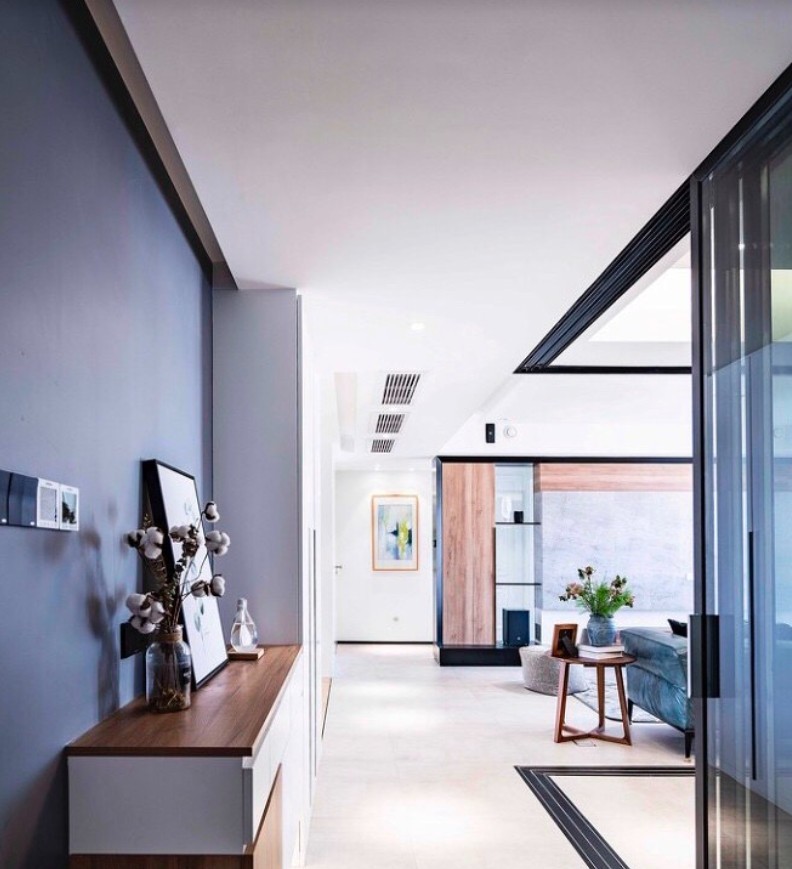 厨餐厅扩大后,客厅进深被压缩,所以在过道足够情况下,电视墙做了延伸,好让客厅空间显得大些;