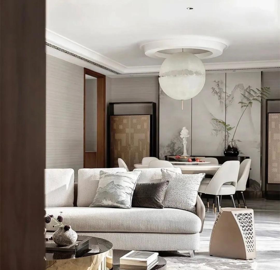 客厅以新中式风格为主,吊顶上做了一个水晶圆球吊灯显得十分的轻奢;软装上搭配布艺沙发以及圆形金属茶几,台面上摆有多个不同的装饰进行摆设。
