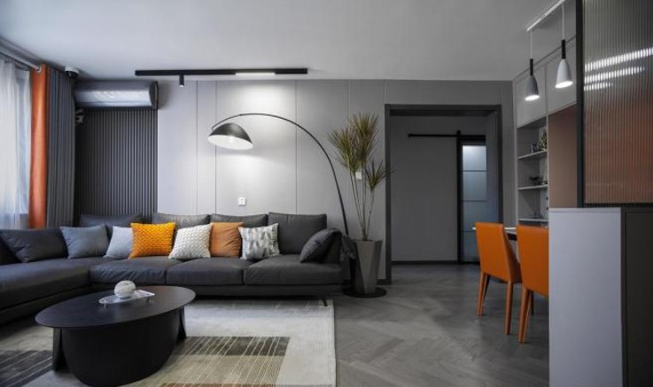 客厅整体的户型方正,深灰色科技布沙发,搭配灰色背景墙板。用部分黑色木格栅的提升背景墙的对比感,亮橙色抱枕与超大盆景落地灯恰到好处的修饰,与顶部射灯直射沙发中心的光线重合,打破深灰色的深沉和寂静感。 沙发科技布的选择和实木茶几的选择,充分考虑到主人养狗狗的需求,材质上抗拉扯,结实耐用,便于清洁,并且具有皮质的美观与质感。