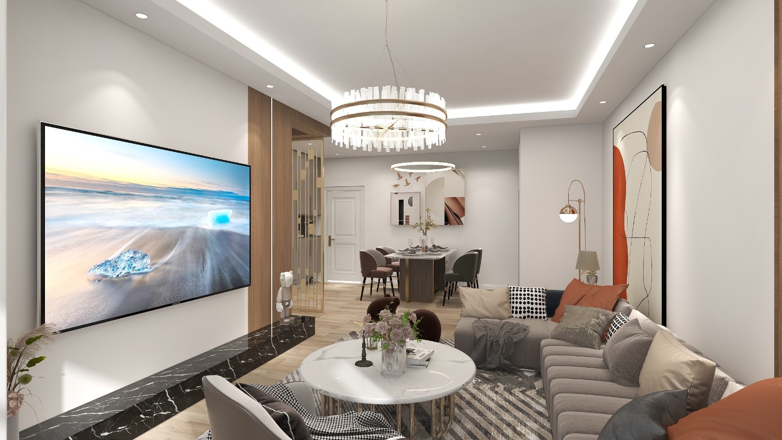 客厅空间没有做过多造型,沙发背景墙和电视墙做了一部份墙板加上线型灯带做点缀