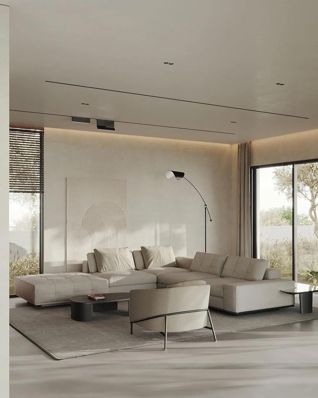 简洁明快的家具选择,使得客厅空间更加高远,通过落地窗拉近了与自然的距离