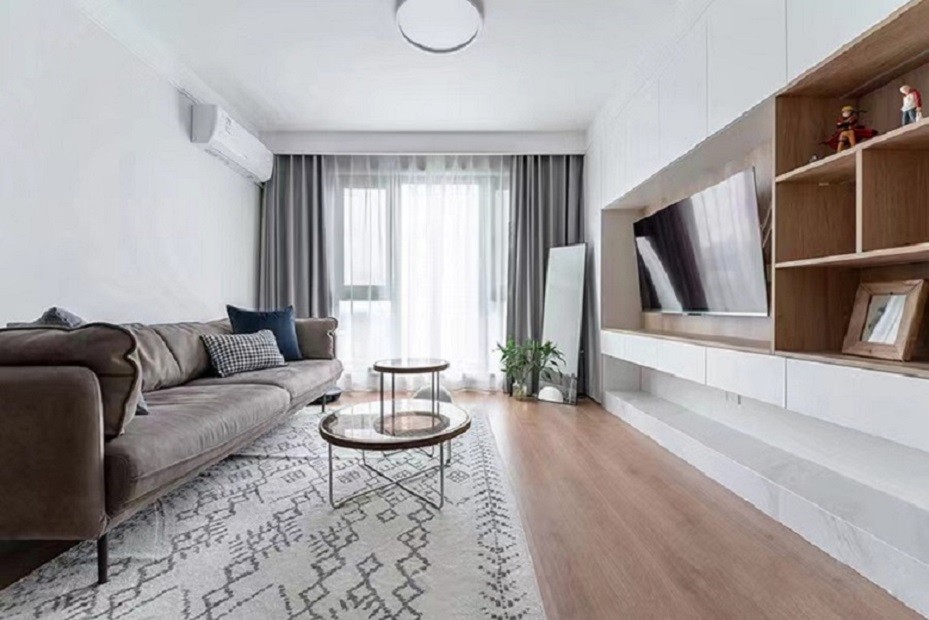 白色的柜体之中镶嵌木色的电视柜,让整体层次感非常明显,电视墙这一部分就将黑白木种颜色层层嵌套,客厅的色彩感瞬间丰富。
