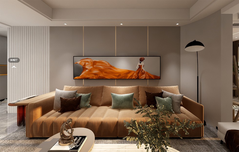 沙发背景墙采用木饰面加格栅设计将客厅整体拉高档次,慵懒的沙发,让业主回家的心更加迫切