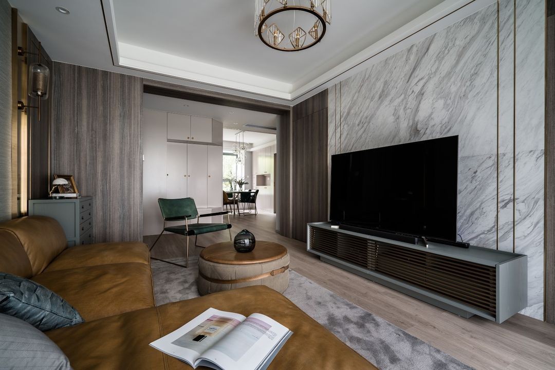由深至浅的渐入,延展了空间深度,金色线条为此增添了些许精致,棕色的皮质沙发区套件,大理石、木饰面的自然纹理 ,硬朗的材质,将空间结构梳理明了,