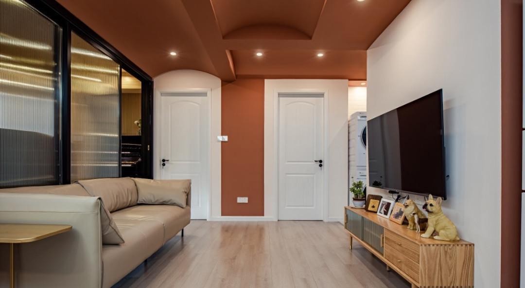 主卧通过拱形垭口的设计过渡到阳台,互映客厅拱形设计。 色调上,因为是卧室,选择了稍微浅一点的粉橙色,视觉上更加恬淡。 而在梳妆台的一角,又做了深一点橙色的拼色处理,使空间更具设计感。
