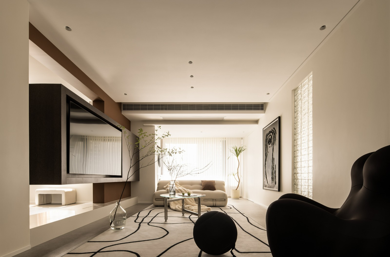 整个公共空间以黑白灰的配色来实现,大面积使用奶白色,提亮空间,辅助以灰色、黑色,然后局部点缀棕色。 拆除电视墙墙体,利用剩余的承重墙来做悬浮电视柜,上下部镂空,让视线可以穿透过去。