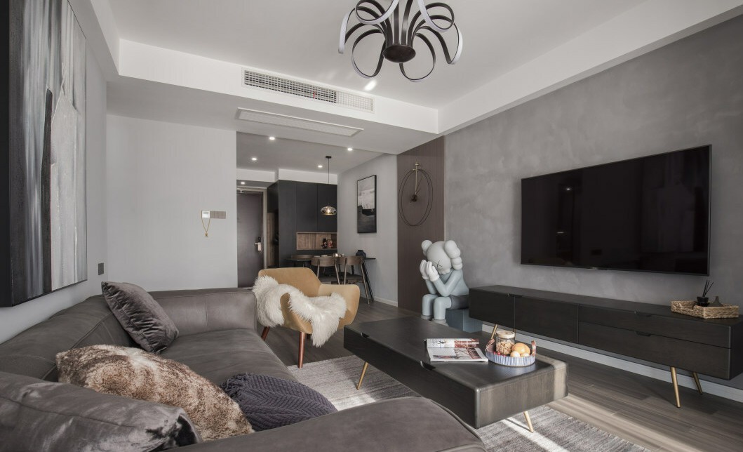 客厅设计上融入不少个性、前卫的装饰元素,低头沉思的玩偶、没有表盘的圆形表针,加上中性色木饰面装饰墙面,整体空间炫酷时尚,又给人一种“裸露”的直接表达。