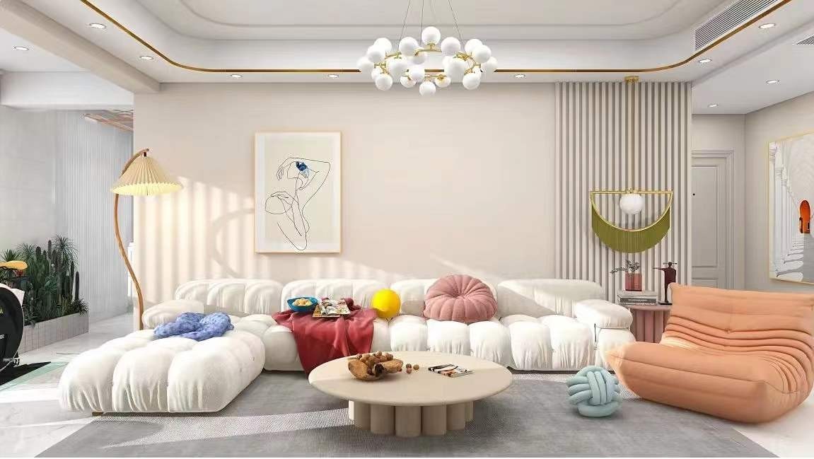 主灯与筒灯结合设计,使得整个客厅整洁轻奢