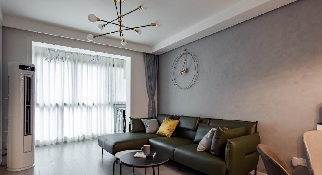 绿色皮质沙发使整个浅色空间层次更加分明,黑白错落的茶几,小巧精致,一只网红款轮廓挂钟点缀在灰色背景墙上。