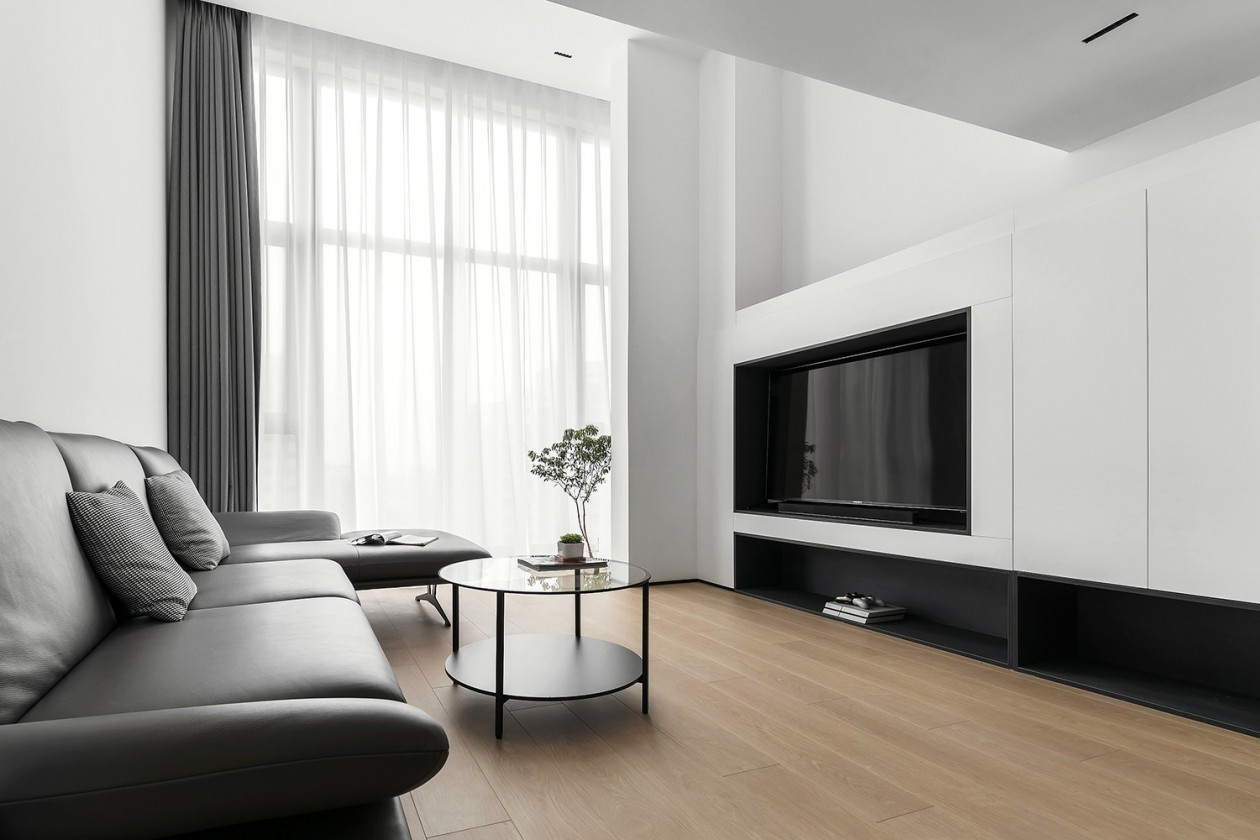 电视墙面利用承重墙体厚度与楼板高度,规划功能型电视背景墙。电视内嵌与柜面平整,底部双开放架,增加部分收纳空间,实用与美观兼顾。
