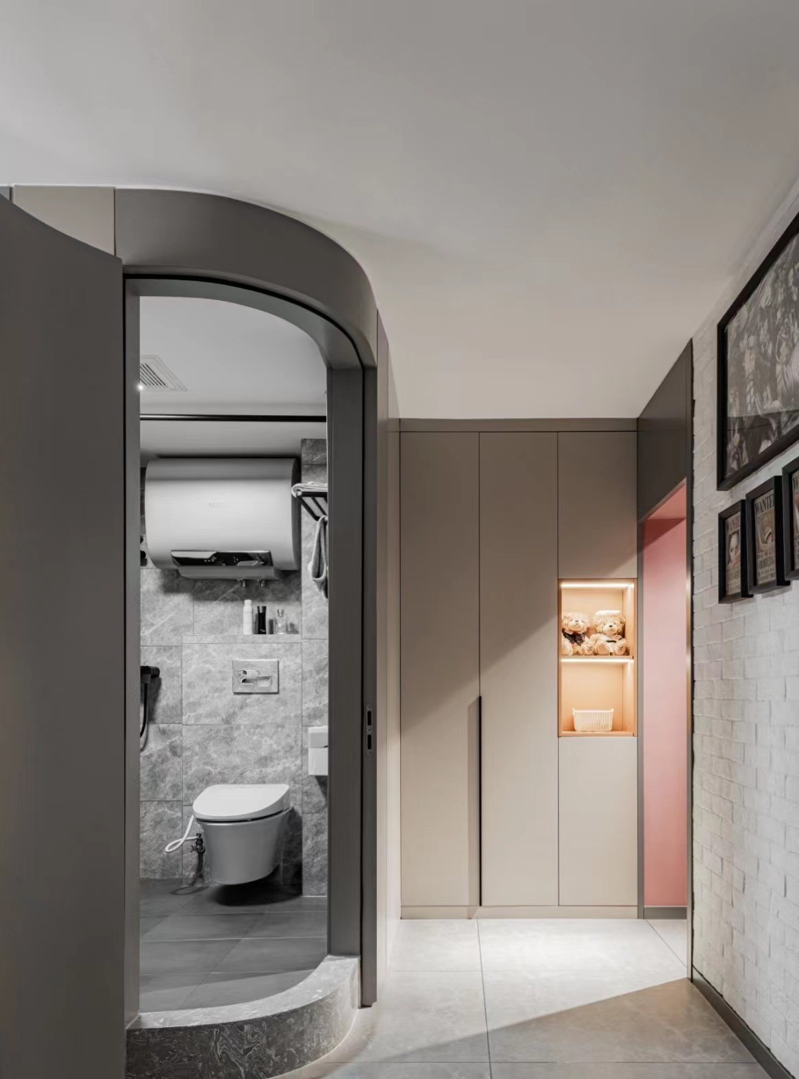 卫生间区别于常规的正正方方,这里的卫生间造型是半圆形的。因为是卫生 间独立在公共空间所以需要保证整体的隐私性,这里连接厨房都是采用全屋定制墙到地完整性很高。卫生间的门也是用的隐形门,隐私性会更强。