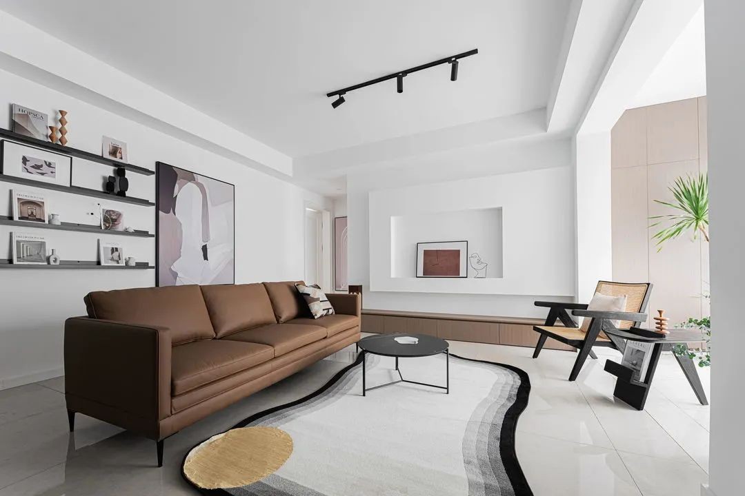 客厅给人的***感觉,就是简约大方。大面积使用白色,一定程度上提亮了空间,加上深色家具,和黑白相间的地毯,又不缺乏时尚气质。在照明设计上,以明装轨道射灯取代主灯,弱化了单一主灯对空间顶部的视觉干扰,让重心集中在地面空间。