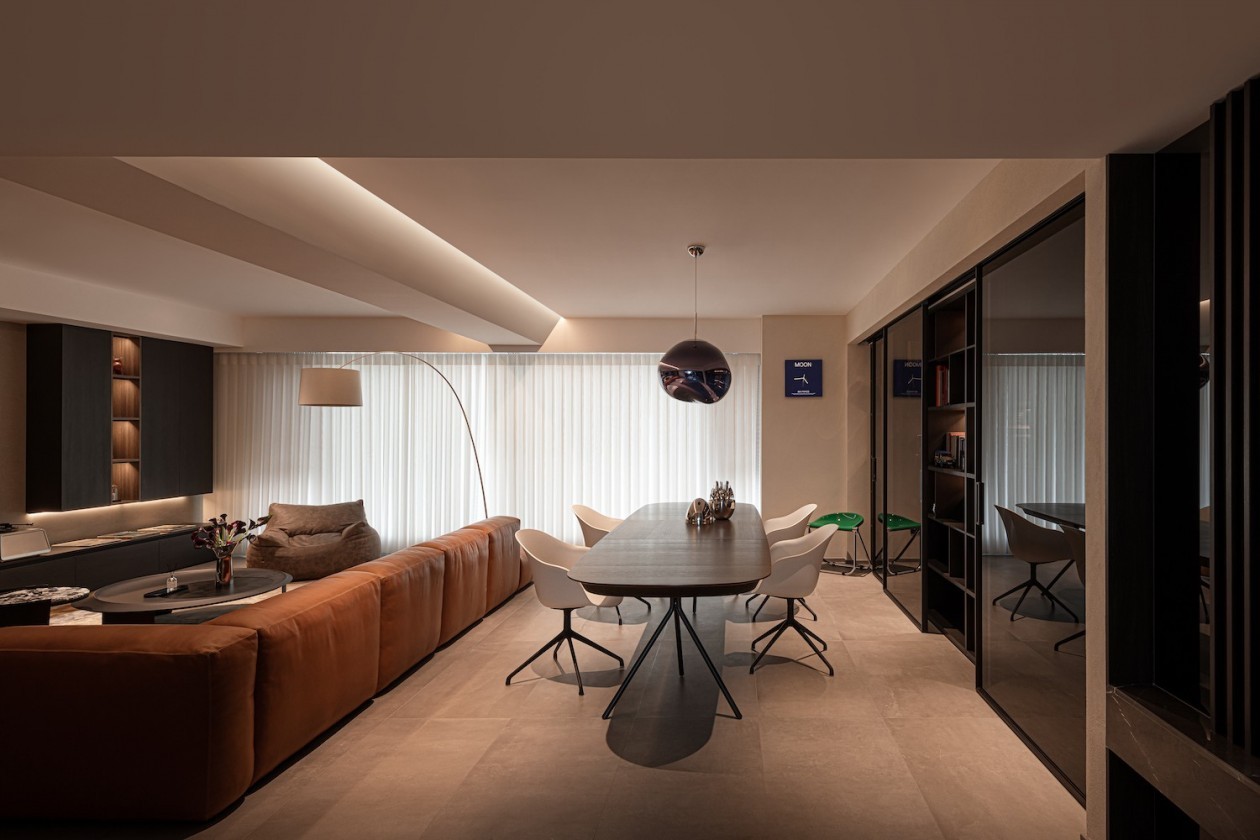 客厅沿用深色作为主基调,棕色与白色调和其中,消减了单调和冷酷感,用开放明朗的空间去承载生活的点滴。