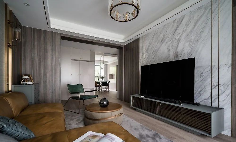 客厅,灰蓝色的电视柜,木栅格的条纹,在白色大理石与木饰面的色块背景下,产生清爽轻盈的视觉体验。