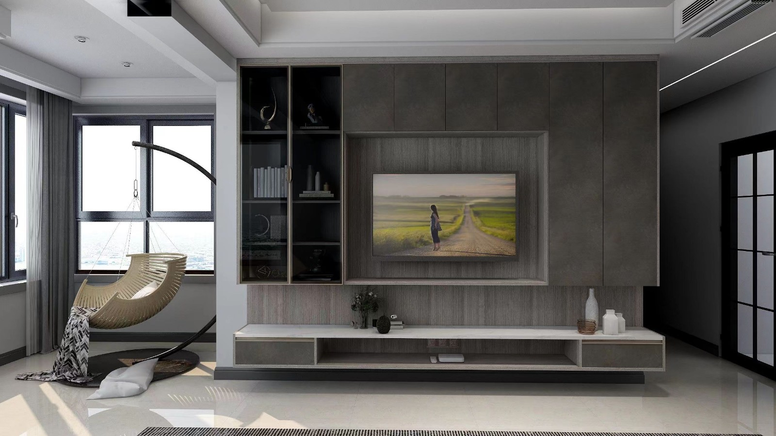 业主不喜欢传统的背景墙,考虑用柜子代替,增加收纳。黄色单椅和金色摆件作为点缀,让空间不至于太过冷淡.