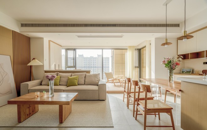 客厅区域白色与浅色系原木相互交织,营造出温馨、简约的氛围