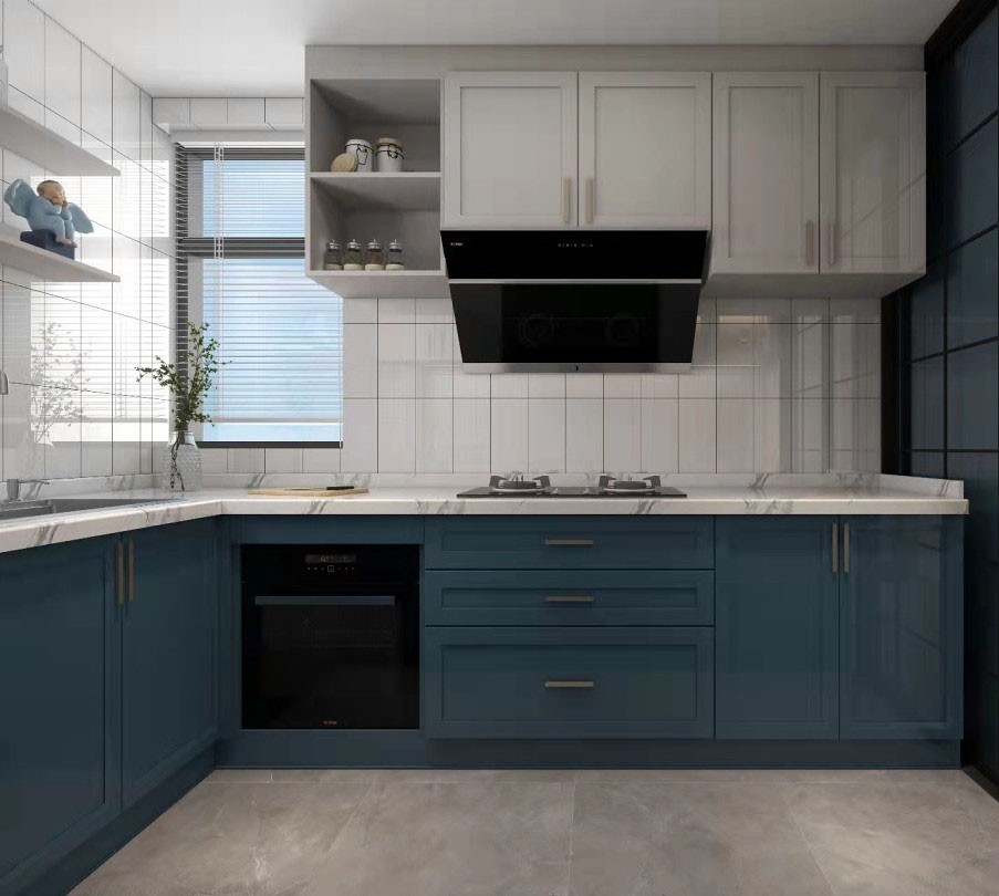 蓝色延续到厨房,整体色调和谐统一