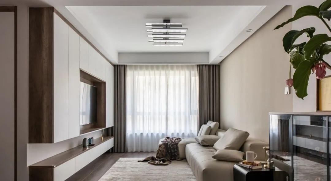 改造后白色+浅胡桃木的配色,给人一种简约、明朗的感觉,即使拉上窗帘也不会觉得昏暗! △ 电视背景做成2400*3200*400的满墙电视柜,一下子让收纳空间翻了倍!