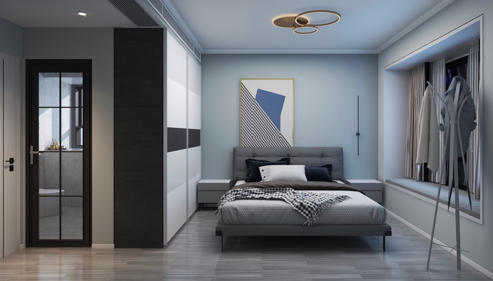 次卧用简单的壁画增加了房间的氛围感。