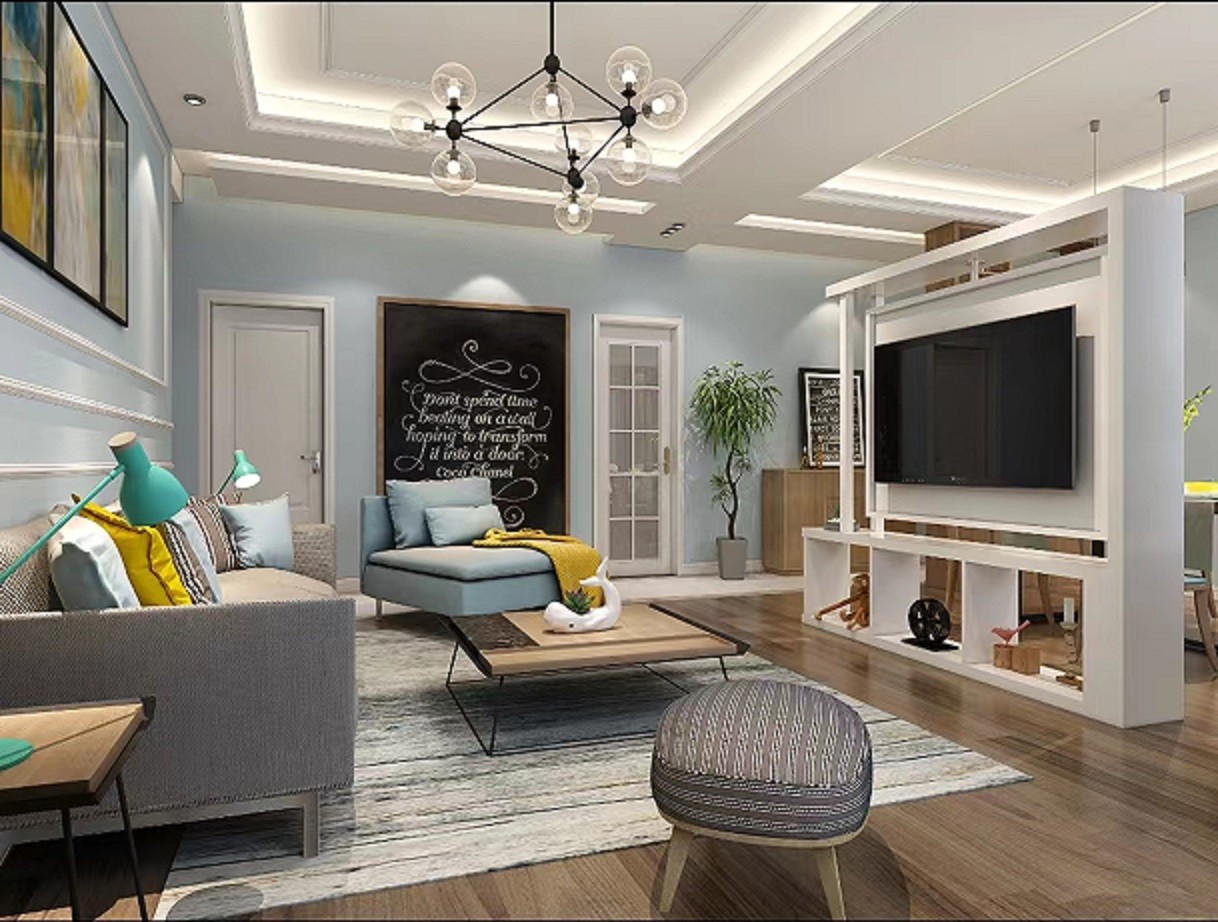 墙面采用天蓝色的涂漆,顶面回字形吊顶,搭配暗藏灯带和筒灯,主灯选择现代造型灯。