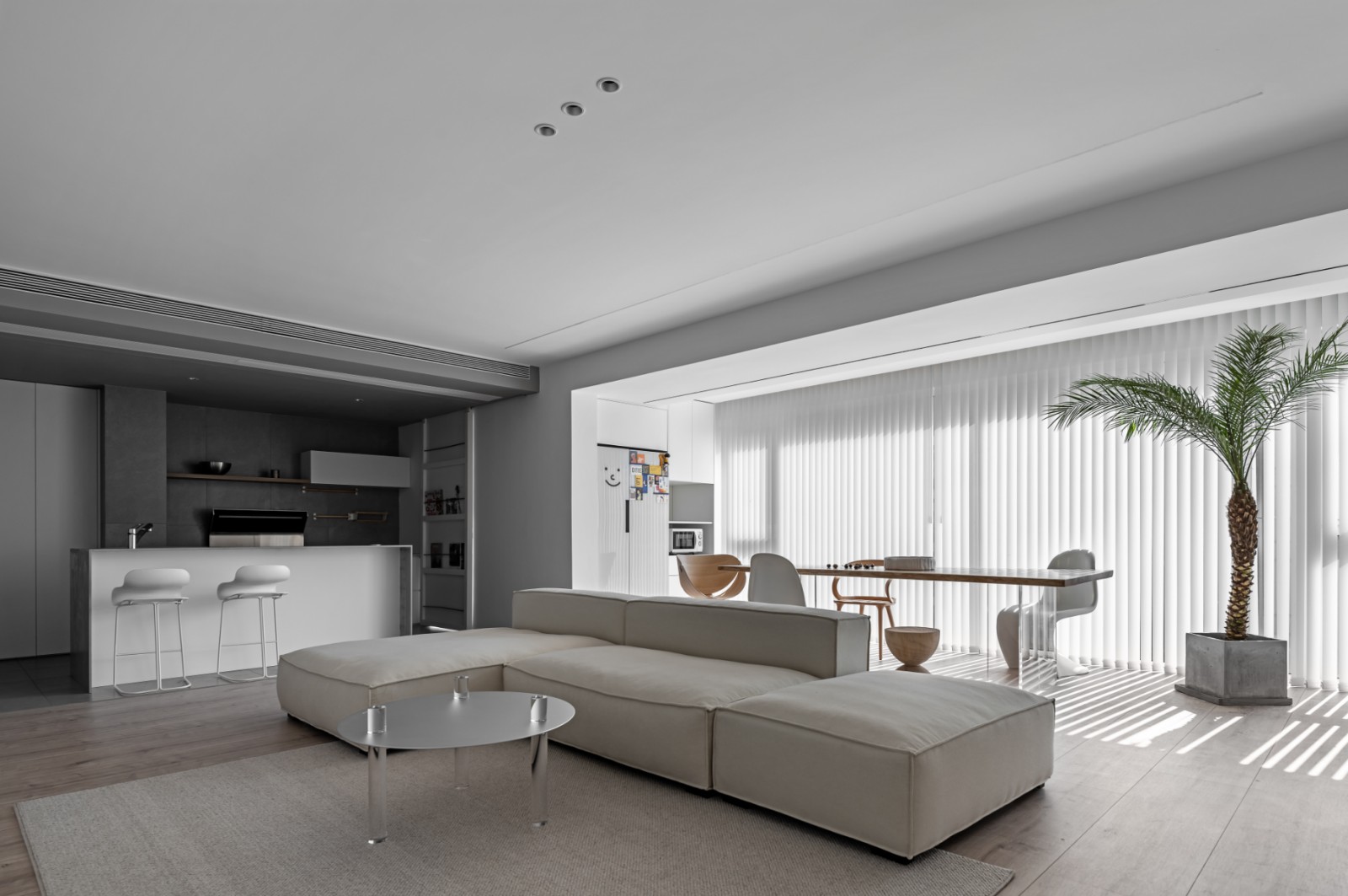 阳光透过百叶帘,使光影铺满整个餐区,Panton Chair悬臂梁式的结构延伸出如人体曲线般优美的线条,这定格的绝美一瞬,让用餐都显得舒适而浪漫。