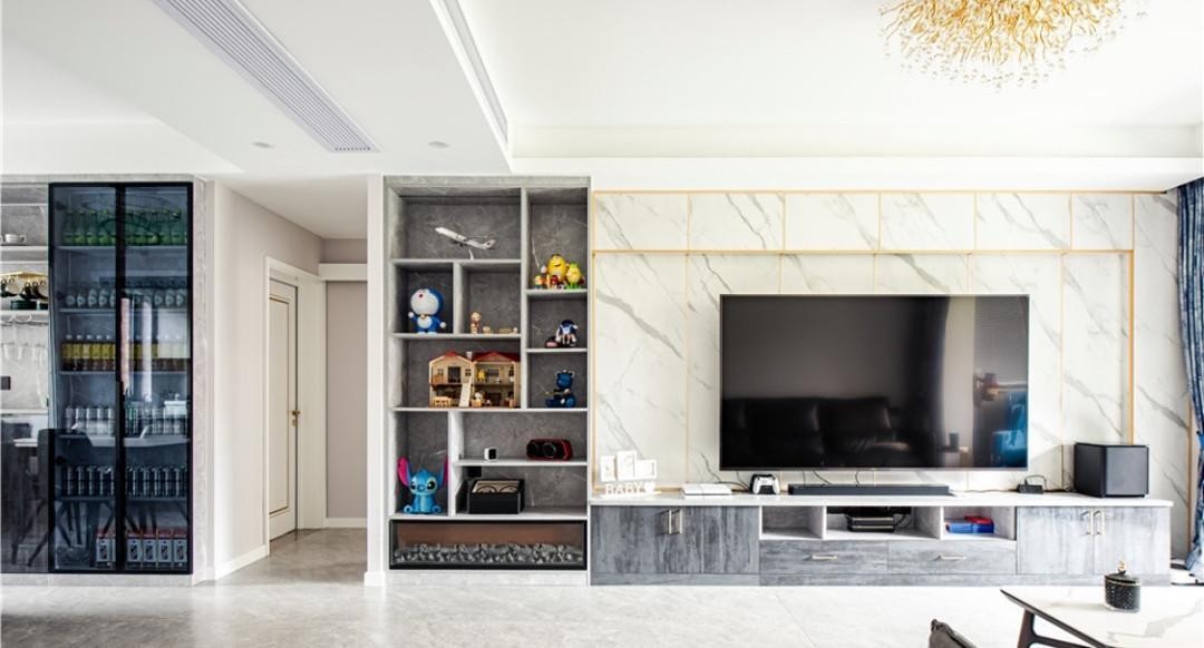 大理石电视背景墙无比贴合轻奢的主调,让客厅展现出大气、优雅的气质,提升档次。搭配金色线条作为点缀,越发有质感,让人百看不厌。