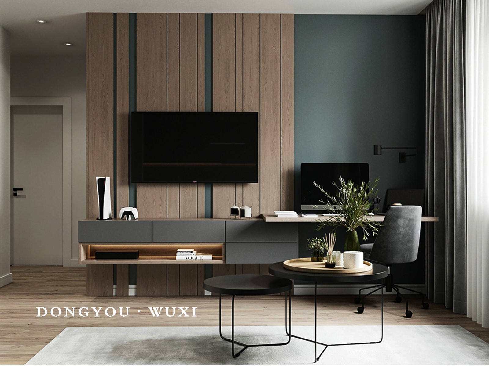 客厅取消电视柜装饰,把书桌和电视柜结合在一起,设计感满满。