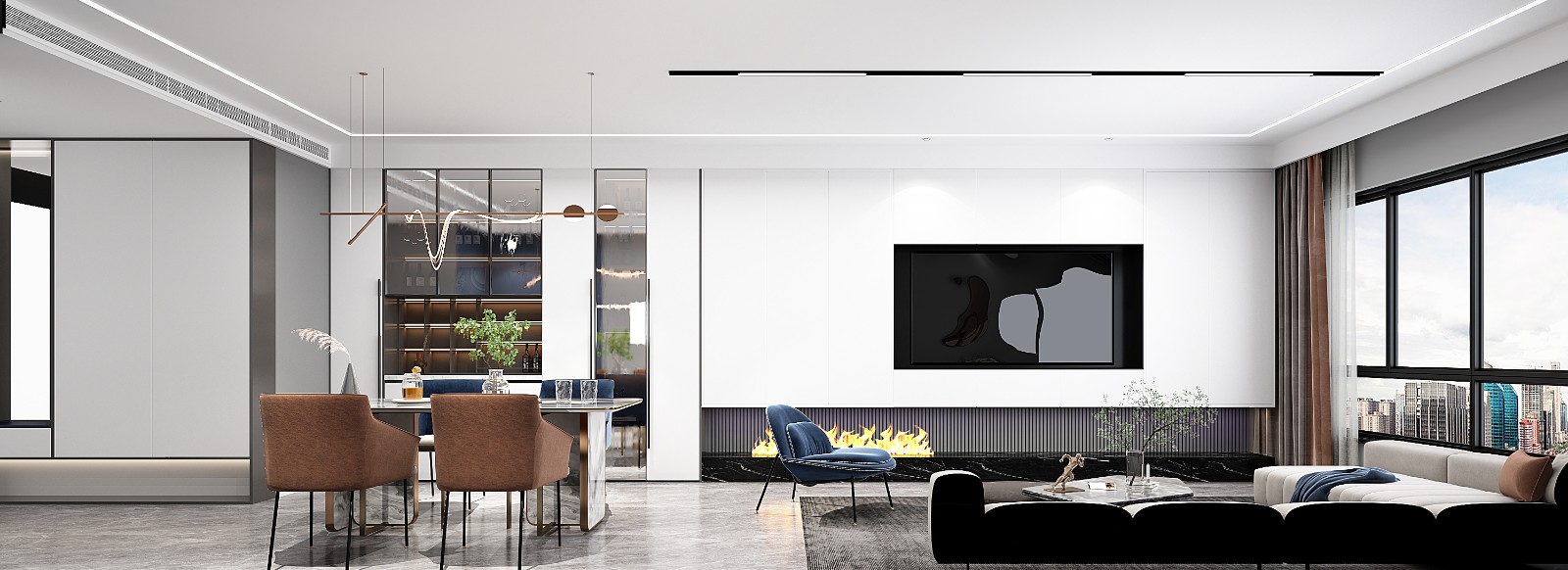 客厅电视背景墙是一长排柜子,多了很多储物,保证整个空间的视觉干净流畅。