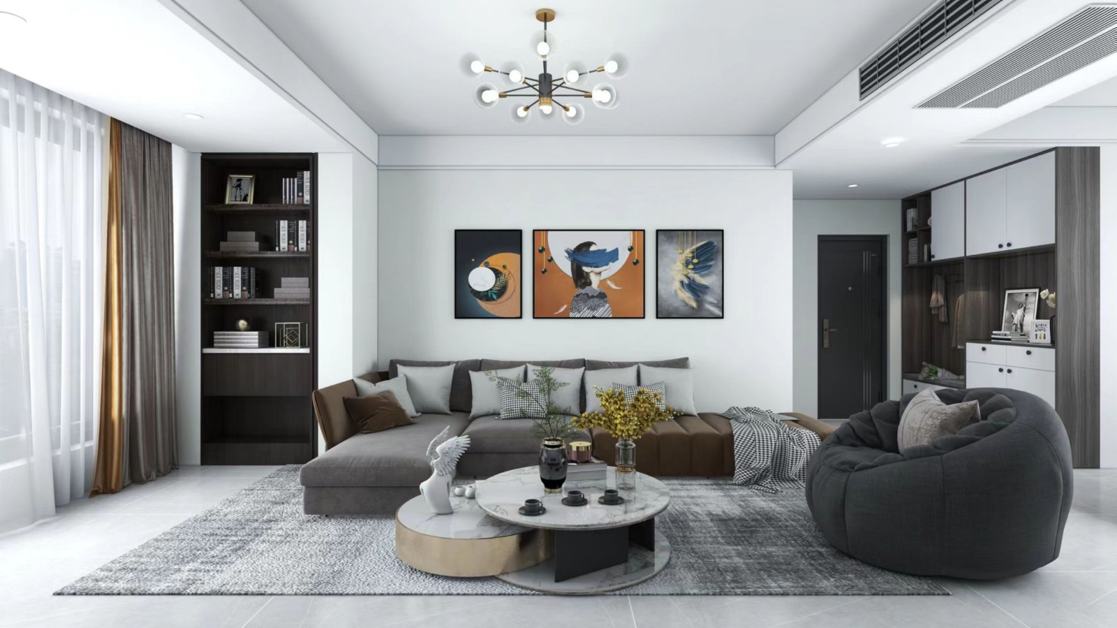 整个客厅以现代大方的空间格调,在温馨优雅的空间格调下,呈现出一个舒适轻松的居住氛围。灰色调的布艺沙发搭配金色调的装饰画,沙发墙上方再挂上几个吊柜,整体显得格外的优雅而实用