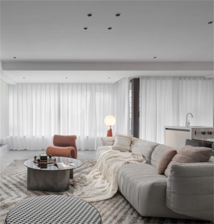 三人沙发、方几、躺椅共同构成了一个自由切换状态的休闲空间,沙发款式与尺度的选择实现了同时能够满足补充背后餐桌多人用餐的临时就坐需求,美感与实用兼顾。